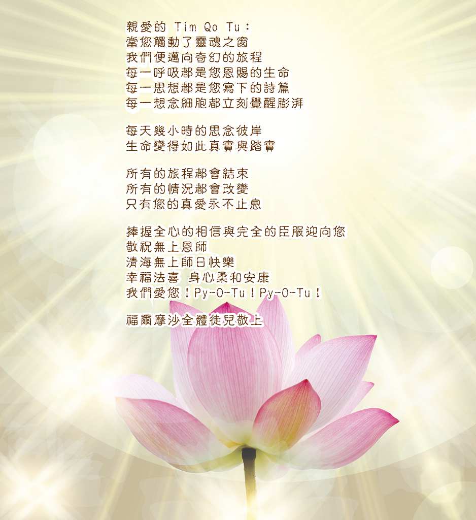 最親愛的清海無上師,全能的Tim Qo Tu–所有世界敬愛的上主,您是所有愛、寬恕和慈悲的初始源頭。我們以永恆無盡的感激之情,感謝您所做的一切及您為所有靈魂得到自由、解脫和安慰所做的無數犧牲。在令人驚嘆的奇妙宇宙裡的所有眾生,與我們一同慶祝這輝煌榮耀的一天,恭敬地祝褔您永遠和平、快樂、身體健康和喜悅無限!